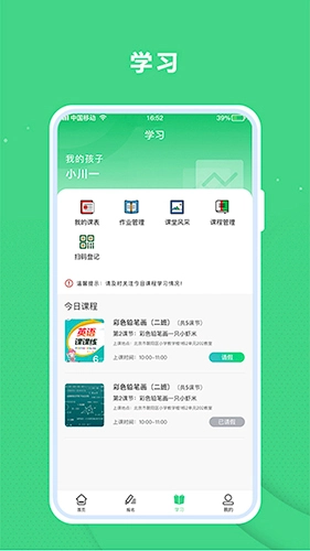3、具备成果发布、课程查询、个人中心等功能支持,学生可在此开展签到等相关操作。