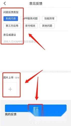 2、打开意见反馈窗口,选定问题反馈类型,填写意见或建议内容,上传相关图片后,点击【提交】按钮。