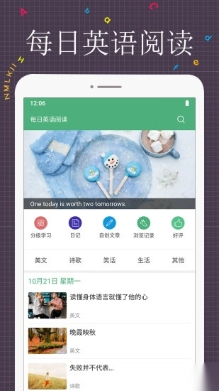 ,内容涵盖美文、美句、诗歌、笑话、故事、文化、科技等分类,更有超多专辑。此外,还背单词、词典、翻译、生词本、日记、、文章朗读、中英切换、点屏查词、自创文章等实用功能,让您学习更轻松。