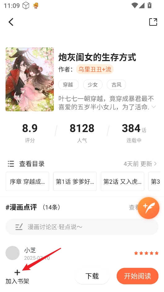 的漫画详情页面,浏览其中的简介以及目录信息。