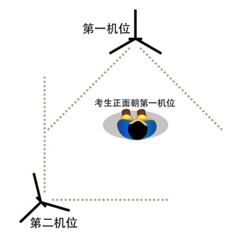 模拟考试与正式考试均采用双机位设置。部分专业的考试系统内会提供示范视频或主机位示范图片,考生可依据这些示范要求来摆放机位。对于未作特别规定的情况,双机位的摆放可参考上图所示。