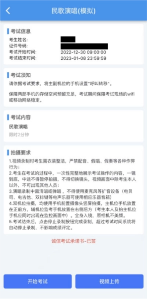 3、诚信考试承诺书仅需签署一次,签名完成后,考生可查看考试信息、考试须知、考试内容以及拍摄要求。部分专业还提供了示范视频,考生可点击观看。