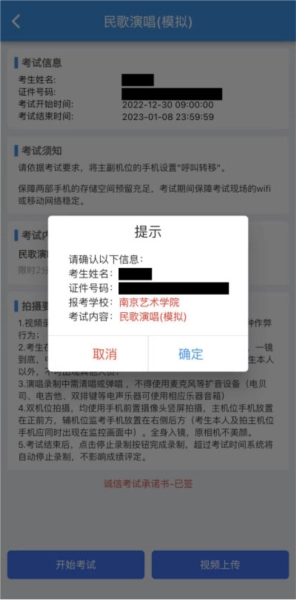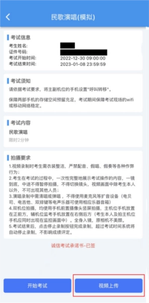 9、视频录制结束后,点击【视频上传】按钮,查看录制好的主机位考试视频,选中后点击【确认上传】。接着用辅机位点击【扫一扫】功能,扫描主机位上的二维码,完成辅机位(监考)视频的确认上传操作。