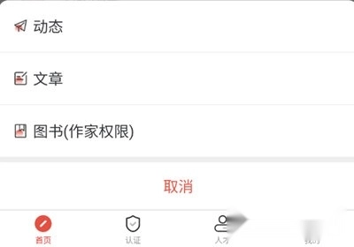 点击首页或创作中心右上角的“+”按钮,会弹出一个选项框,目前框内有动态、文章、图书(图书需在PC端发布)这三种选项。