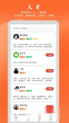 为乡村人才提供在线创作增收、上纸刊、在线写书发行、在线图书封面模板使用等服务,并支持他们参与各类乡村文化活动,助力乡村人才在乡村人才库中链接更多资源、创造价值,实现劳有所得。
