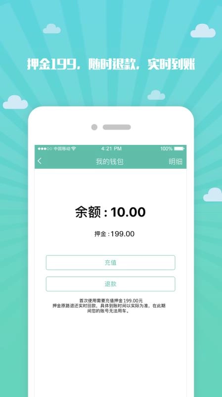 在解锁前支付押金,结束使用后即可全额退还,且退款到账速度快。