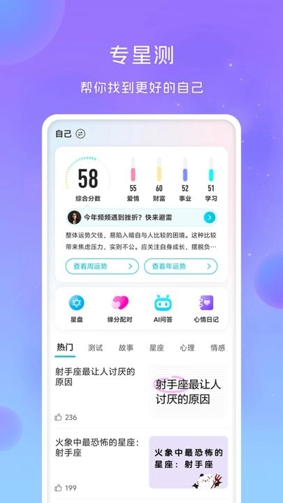专星测,这款优质应用致力于为用户增添生活乐趣,助力大家拥有积极心态。它不只是个简单工具,更是你生活里的贴心伙伴,陪你探索自我,迎接生活中的每一份美好。