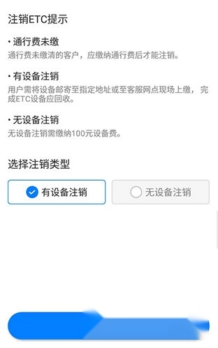 2、进入ETC注销页面,选择“有设备注销”或“无设备注销”,接着填写对应的相关信息,完成后点击“立即注销”按钮即可。