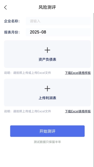 3、在风险测评界面,输入企业名称与报表月份,添加资产负债表并上传利润表后,即可进行评测。
