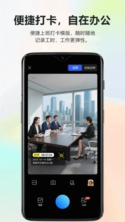 相机配备多款打卡专属水印模板,时间与北京时间同步,能精准定位当前位置,让打卡更轻松,随时记录工作与生活瞬间。水印的时间和定位信息会实时更新。