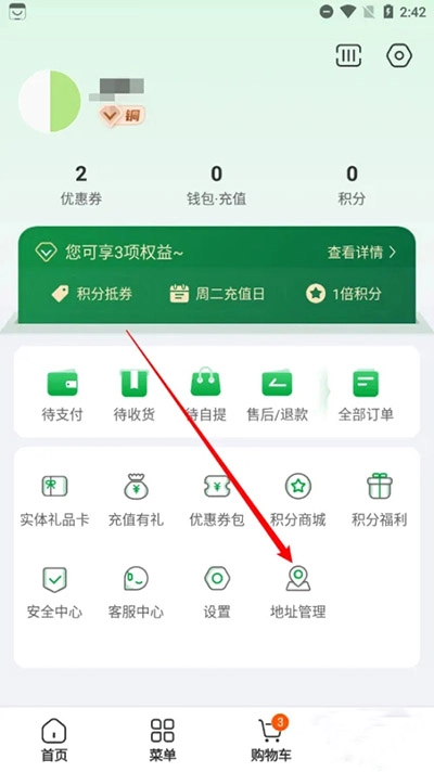1、打开锅圈云铺,进入“我的”界面,然后点击【地址管理】选项。