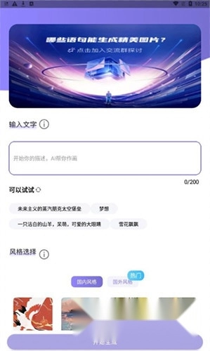 1、输入关键词,的AI技术可以激发您的想象力,把单调乏味的关键词即刻转化为充满创意的画作。