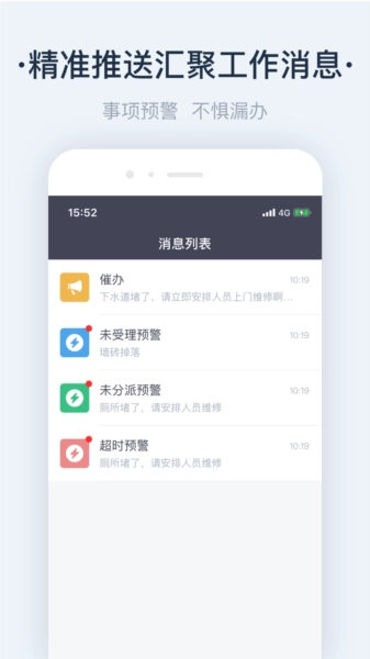 2、精准的消息推送:报修申请及其他重要事宜可即时推送给相关人员,防止遗漏。