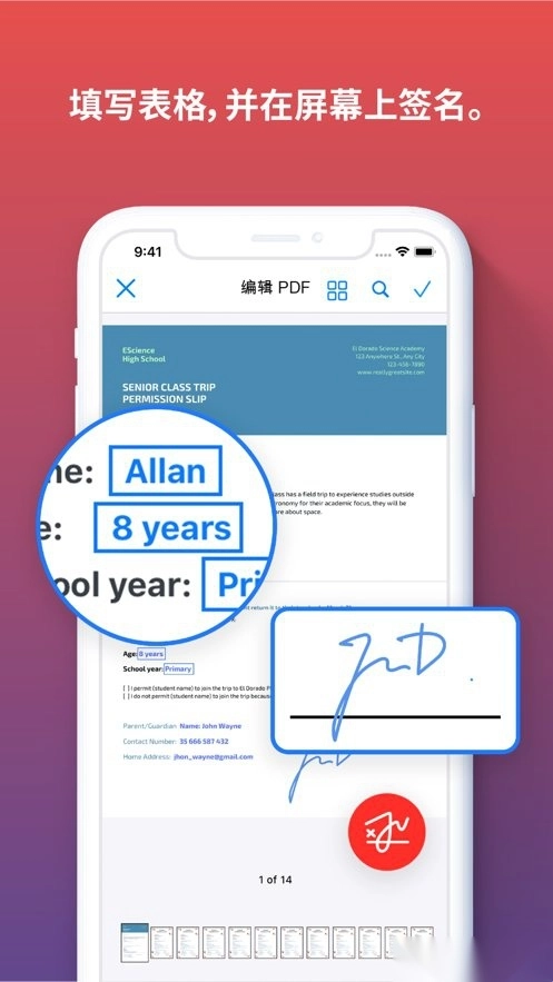 填写表格与签名:可快速完成PDF表格的填写、文本输入,接着通过手指完成电子签名。