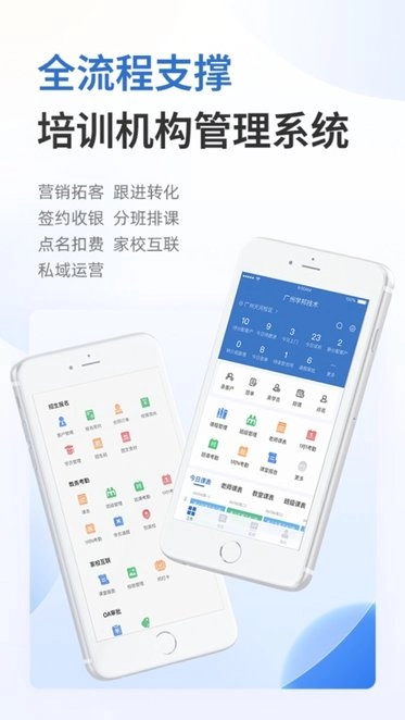 ·全面的业务支持:涵盖市场推广、咨询招生、课程产品管理、合同报班、票据打印、学员服务、在线预排课与调课、上课考勤与扣费、资金账务管理、业务统计分析等多个方面;