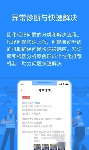 对现场问题的分类与解决流程进行固化。通过现场问题的快速上报机制以及问题自动升级机制,保障问题能够得到迅速响应。利用知识库与根因分析案例构建个性化推荐机制,帮助快速解决问题,降低生产等待造成的浪费,从而实现生产稳定的目标。