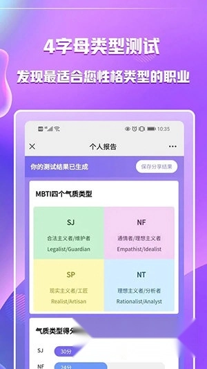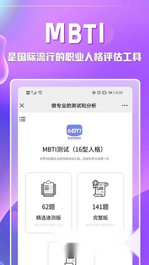 MBTI职业性格测试是一款心理分析软件,作为个性判断与分析的工具,它从多样的个性特征里,提炼出动力、信息收集、决策方式、生活方式这4个关键要素展开分析,以此区分不同个性的人。如今,该软件已成为全球应用范围较广的人格测评工具之一。它主要用于了解受测者的处事风格、特点、职业适配度、潜质等,进而给出合理的工作及人际决策建议。MBTI测试能帮助我们更深入地认识人的性格特点,不过不能仅依据单一的测试结果,就对一个人的心理特征下结论。所以,若想切实了解一个人,需采用多种方法、从多个维度进行考察,再结合心理测试结果辅助分析,这样才有可能得到较为可靠、客观的结论。