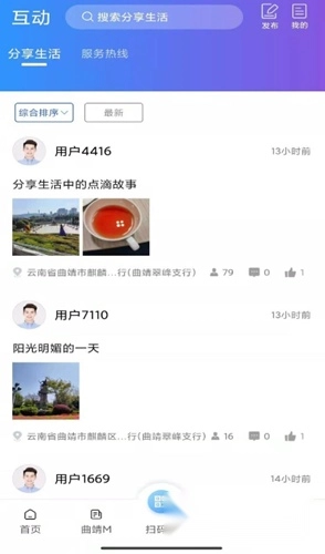 首先,我们打开曲靖通,然后点击【互动】,再点击【发布】选项。