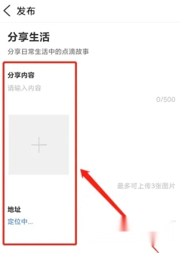 第二,在完成上述操作后,我们只需输入分享内容、上传相关图片、进行地址定位,最后点击【提交】按钮就可以了。