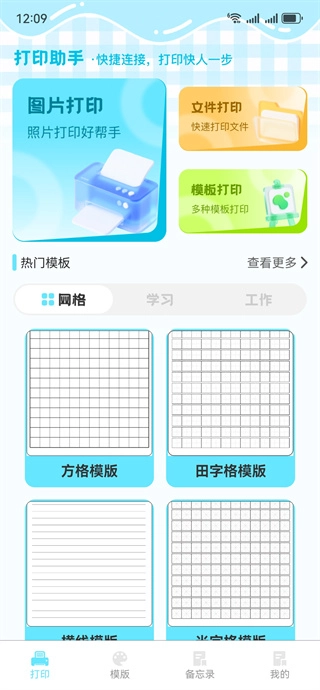 3、打印助手提供丰富多样的打印模板,涵盖网格、学习、工作三大类别。