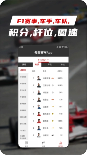 整合国内F1与MotoGP的赛事数据,车手及车队信息清晰呈现,助力用户剖析比赛局势。