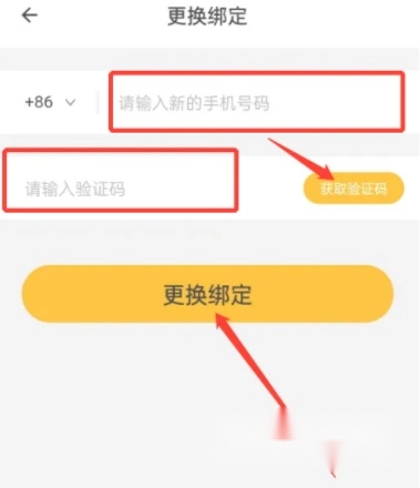 3、进入【更换绑定】页面,输入需要绑定的号码,点击“获取验证码”按钮并输入收到的验证码,最后点击【更换绑定】按钮,就能完成绑定更换操作。