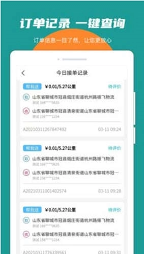 1、振飞同城接单的订单记录,支持一键查询,订单信息清晰呈现,让您更安心;