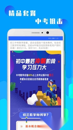 这款软件具备在线学习效果分析与成果报告功能,用户能随时掌握自身学习进度。其套餐内容覆盖数学课程的各个板块,助力学生扎实掌握重点知识。借助18个精心规划的课程,用户可选择多样化的学习路径,以解题为核心辅导方式,帮助大家高效提升学习成绩。无论用户是希望提高中考数学成绩,还是想要巩固数学基础,这款应用都是理想之选。