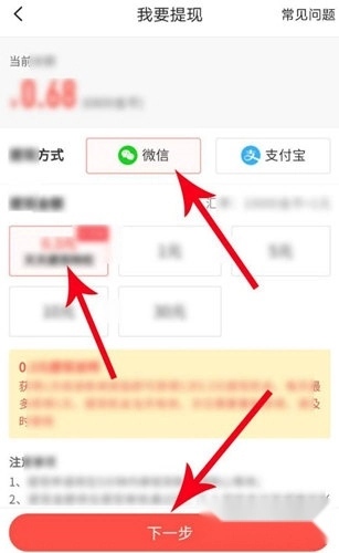 2、随后挑选提现的方式和金额,再点击下方的“下一步”按钮。