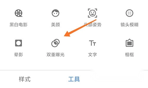 1、第一步是打开snapseed应用,导入要处理的图片,接着点击底部菜单栏中间位置的“工具”选项,再从工具列表里找到并选择“双重曝光”功能。