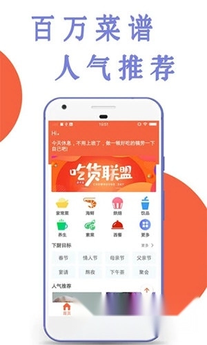 3、进入首页,查看下厨目标、人气推荐、家常菜等