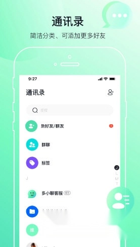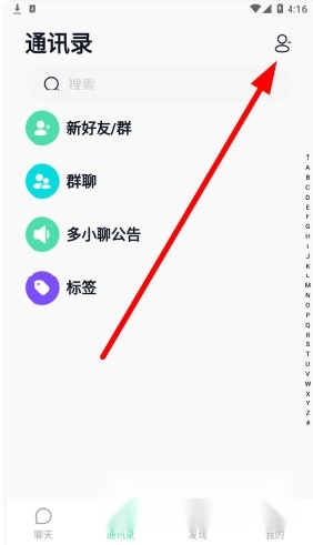 1、启动多小聊应用,进入“通讯录”页面,在该页面点击右上角的“+”按钮。