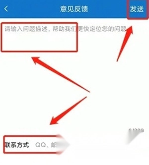 3、进入意见反馈页面,填写反馈内容与联系方式后,点击【发送】按钮。