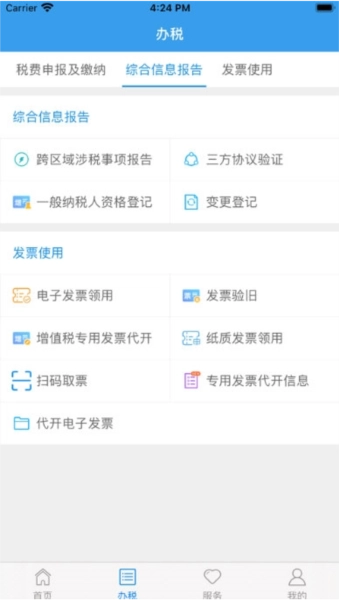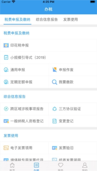 8、涉税服务:国地税纳税人可进行基本涉税信息的查询(涵盖基本登记信息、发票信息、申报征收信息等)与处理(包括发票领用、一键零申报及二次扣款操作),同时还提供一些实用工具。