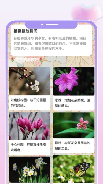 花汇趣看就像花卉王国的向导,带领你走进一个绚烂多姿的花海天地。它不只是一款应用,更是每位花卉爱好者心中的知识宝库。在这里,你能轻松获取各类花卉的详细信息,不管是常见的玫瑰、茉莉,还是珍稀的兰花、郁金香,它们的奥秘都将逐一揭开。从种植技巧到病虫害防治,从土壤挑选到施肥周期,所有你想了解的花卉养护知识,都能在这里一站式掌握。软件还用心规划了一系列花卉拍摄教程,教你如何运用光线、构图等技巧,捕捉花卉的灵动之美,让你的摄影作品更具吸引力。