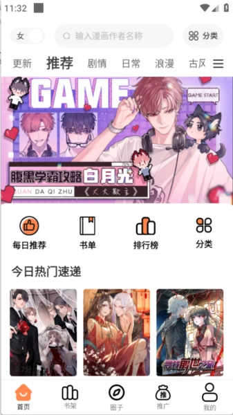 2、首页对漫画进行了详细的分类,涵盖剧情、日常、浪漫等多种类型。