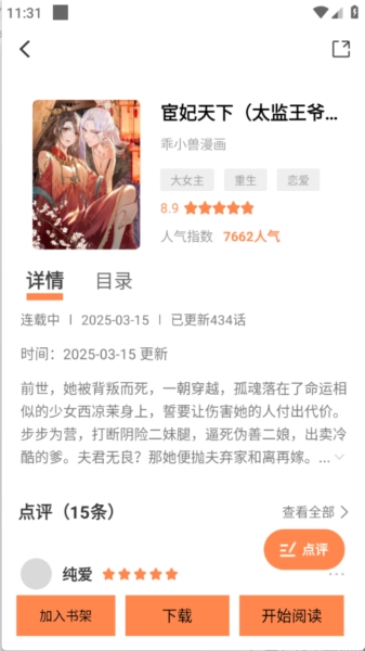 4、用户点击进入心仪的漫画资源详情页后,可进行加入书架和开始阅读的操作。