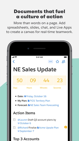创建电子表格,借助实时Salesforce数据、实时聊天功能以及在幻灯片中嵌入图表的能力,助力决策制定。