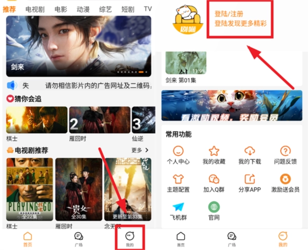 打开剧喵后,点击界面右下角的“我的”选项,进入个人信息相关界面。在该界面上方找到“登录/注册”字样并点击,即可打开注册入口。