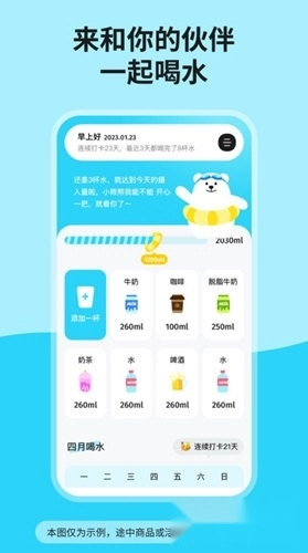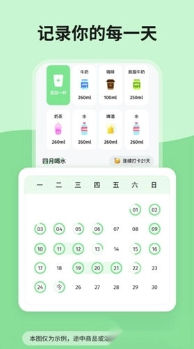 日历查看记录:以直观的日历形式呈现您的喝水记录,方便您随时查看和分析自己的喝水情况。