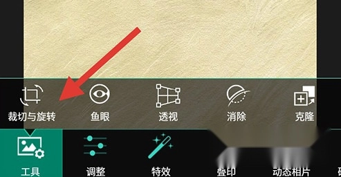2、选择图片进入编辑页面,点开第一个工具选项,在弹出的选框里选择裁切与旋转。