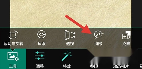 1、在相片大师的编辑界面中,找到工具选项并点击,然后选择消除功能。