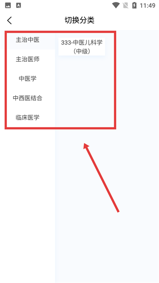 2在界面左侧的分类选项中定位到“主治中医”这一类别,点击进入后,从展开的子选项里选取“333-中医儿科学(中级)”,通过这一操作切换至目标学科分类,即可查看该学科的相关内容。