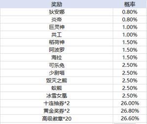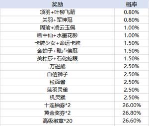 活动期间,每充值60钻石就能得到一个军师礼包,礼包内含司马懿、神白泽、蝎尾狮、末日神罚、阿修罗、利维坦、通灵之眼、哪吒、巴风特、牛奶兔、茉莉茶兔、黑魔隼、灯神鹦鹉、生肖・虎、十连抽券*2、黄金奖券*2、钻石*60中的任意一种奖励~