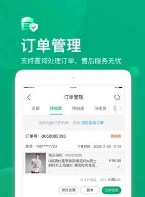 订单管理功能十分强大,所有订单都依据状态类型进行了详细分类,无论何时何地都能便捷地查询和处理订单。