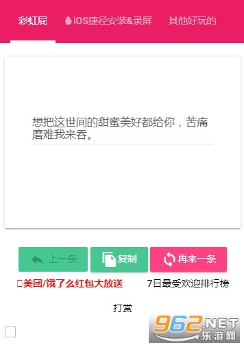 《彩虹屁自动生成器》是一款专为朋友们设计的情话语录工具,尤其适合男性用户使用。这款软件操作十分简便,打开后就能看到一条可直接使用的情话,点击下方的“再来一条”按钮就能切换到其他不同的情话内容,还可以通过点击复制按钮将整句情话复制下来,方便直接发送给心仪的女生。