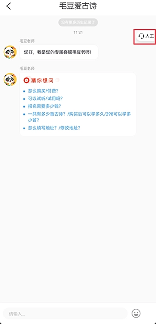 一、打开毛豆爱古诗,点击右上角的客服中心