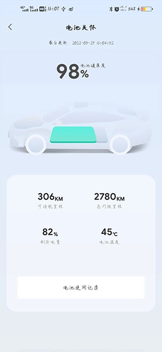 车主借助软件不仅能实时查看电池的使用记录,还能了解剩余续航里程、电池温度以及总行驶里程等信息。