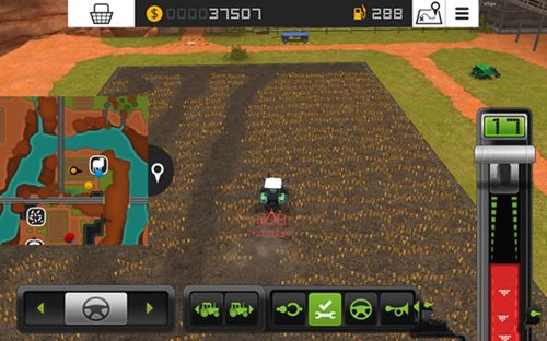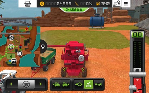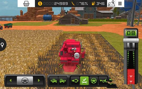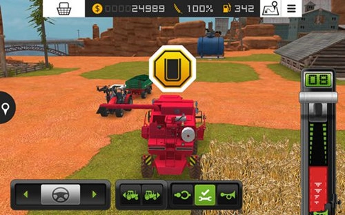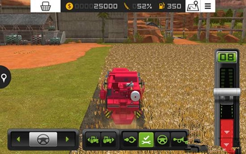 在游戏里,我们需要操控各类农用车辆与工具开展作业,第一步便是操作收割机。把屏幕右侧的推杆向上推动,收割机会向前移动;若将推杆向下推至红色区域,收割机则会向后倒退。