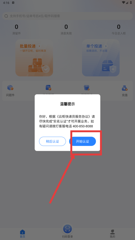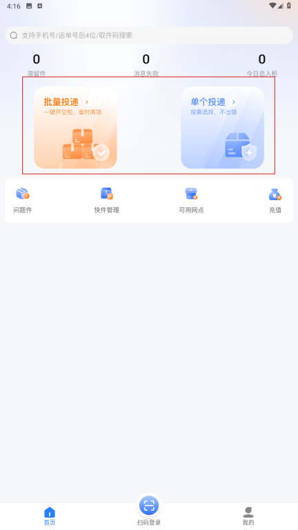 3认证流程结束后,在主页面找到并点击【批量投递】功能选项,即可通过一键操作开启空柜来处理快递包裹。